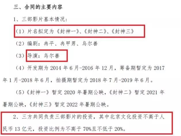 2017年3月,北京文化发布了重大合同公告。公司拟与东阳长生、世纪长生天影业就《封神》三部影片开展合作。协议拟定,北京文化在《封神》三部曲的投资不高于人民币13亿元,投资比例为不高于70%且不低于20%。
