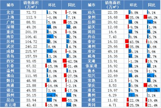 从市场表现来看,供应方面,重点城市整体推盘量稳中略增。成交活跃的城市包括北京、深圳、南京、武汉、成都、青岛等城市。其中销售面积增加最多的是扬州,环比增加104.7%。南京、成都销售面积分别环比增加78.7%和70.6%,显然房子非常充裕。