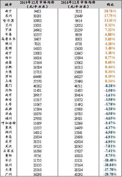 二手房方面,以前不起眼的西宁同比暴涨20.76%,2019年12月市场均价为9483元/平方米。苏州同比上涨17.75%,市场均价为30201元/平方米。二手房都涨这么多了,更别说新房了。