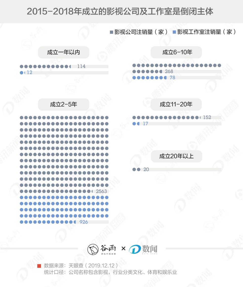 这一系列"自降收入"的操作背后,是一场影视公司倒闭潮。天眼查数据显示,截止2019年12月2日,国内共有3313家影视公司、1033家影视工作室关停。