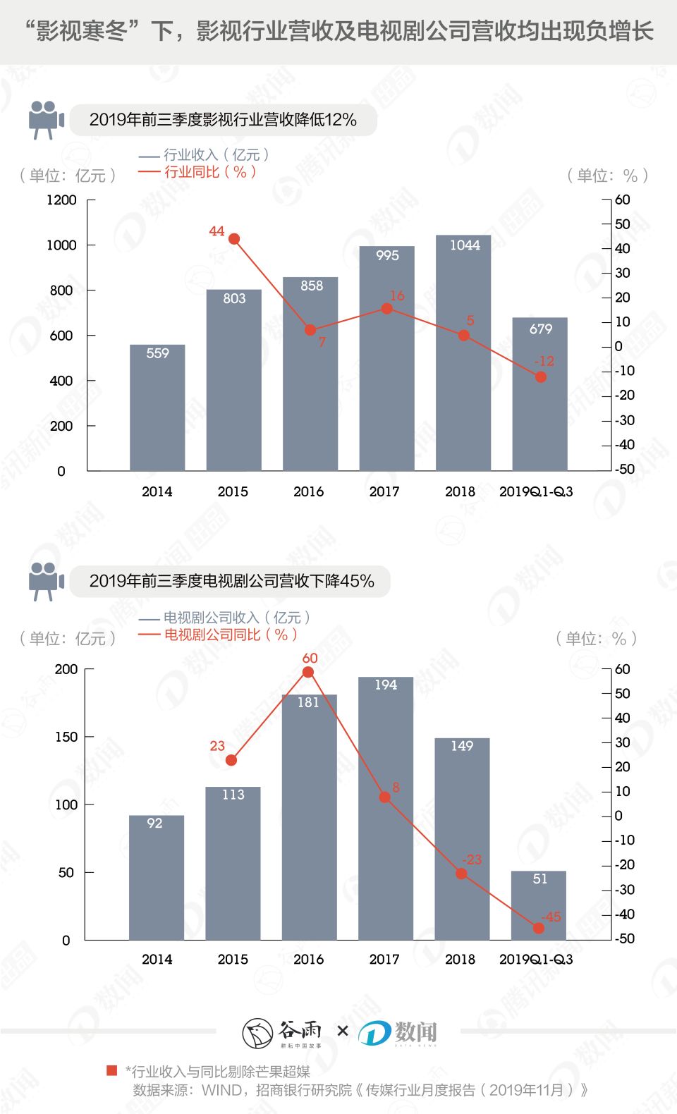 招商银行研究院的月报显示,分析31家A股影视行业上市公司的季报可以发现,2019年前三季度影视行业整体营收679亿,同比下降12%;单第3季度来看,同比下降14%。其中,电视剧行业下滑最大,同比降幅高达45%。