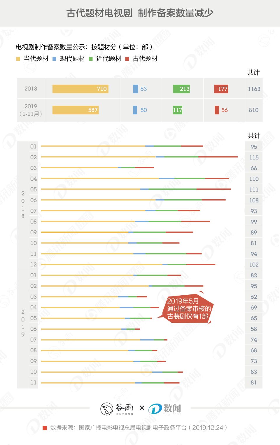 但广电总局电视剧电子政务平台的数据显示,顺利通过备案的古装剧确有明显减少。2019年5月,通过备案审核的古代题材电视剧就只有1部;而2019年前11个月,仅有56部古装剧成功备案,2018年则有177个。