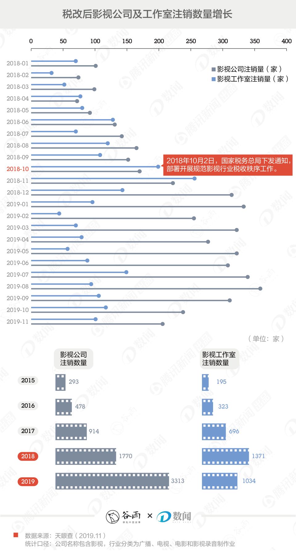 2018年10月初开始规范影视行业税收秩序工作。很快,影视工作室的注销数就从2018年9月的111家跃升到11月的259家,影视公司的注销数也在2019年1月达到了336家,而这一数据在2018年9月仅为155家。