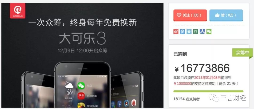 此外,大可乐3还推出了“一次众筹,终身免费换新”模式,即参与众筹即可成为大可乐“梦想合伙人”,参与者每年可以免费换取一部全新的大可乐手机,日后还可参与每款产品的开发过程。