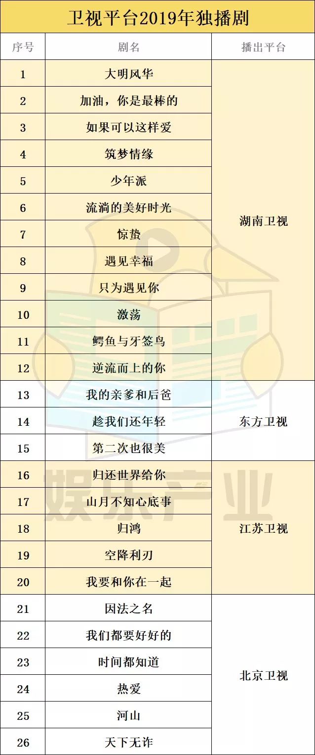 江苏卫视2019年独播剧共计5部,包括《归还世界给你》《山月不知心底事》《归鸿》《空降利刃》《我要和你在一起》;东方卫视2019年独播剧共计3部,包括《我的亲爹和后爸》《趁我们还年轻》《第二次也很美》。