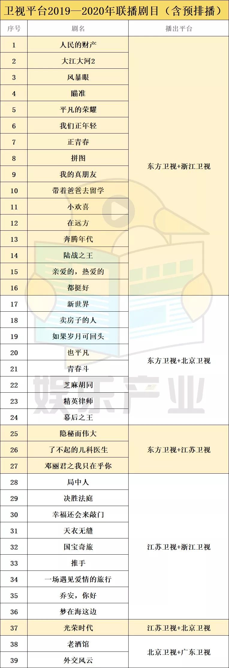 《都挺好》《小欢喜》《亲爱的,热爱的》三部联播剧在2019年取得了较好成绩,东方卫视、浙江卫视今年预计还将联播《人民的财产》《大江大河2》《风暴眼》等剧。