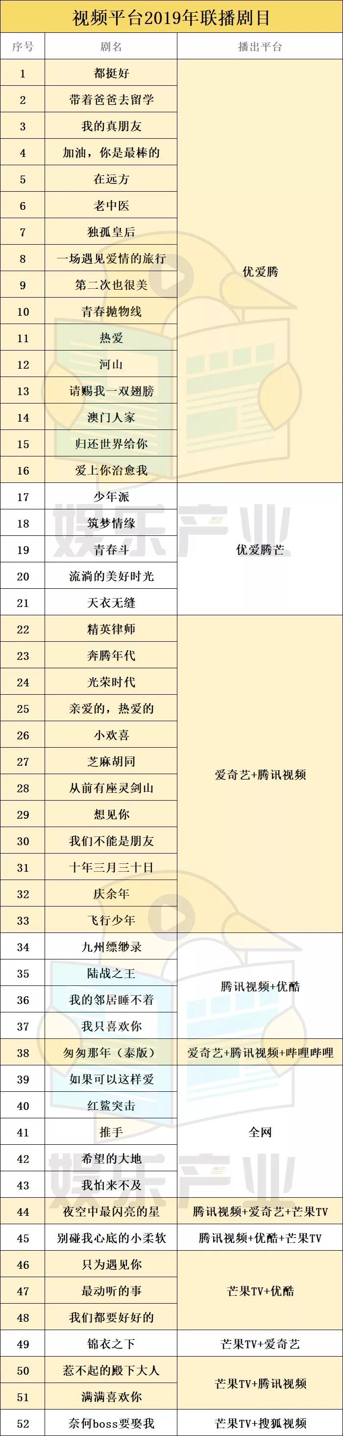 视频平台与视频平台之间的联播合作也讲究气场相合,爱奇艺与腾讯视频明显正在“热恋期”。继暑期档联播《小欢喜》《亲爱的,热爱的》之后,双方又在《精英律师》《庆余年》《想见你》《从前有座灵剑山》等剧目上展开了合作。