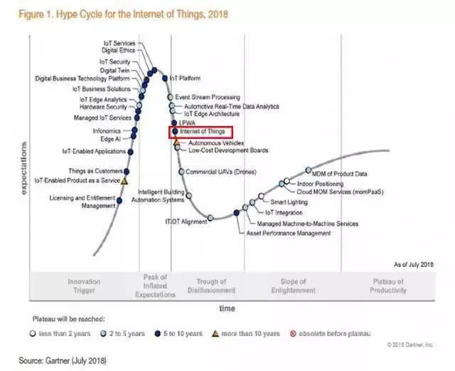 实际上,2018年Gartner发布的物联网成熟度曲线显示,物联网市场还未达到谷底,距离反弹更是有着不少距离。