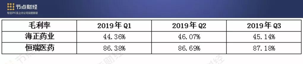 从海正药业的实际经营情况来看,海正药业面临的生存环境仍然严峻。据财报显示,2019年前三季度,海正药业的毛利率分别为44.36%、46.07%、45.14%。同比恒瑞医药,2019年前三季度,恒瑞医药的毛利率分别为86.38%、86.69%、87.18%,海正药业的毛利率水平远低于恒瑞医药。