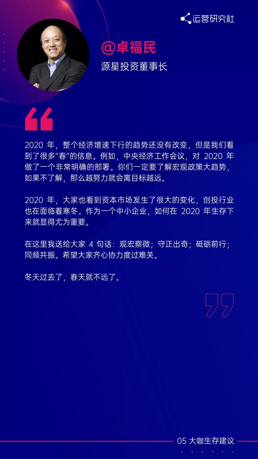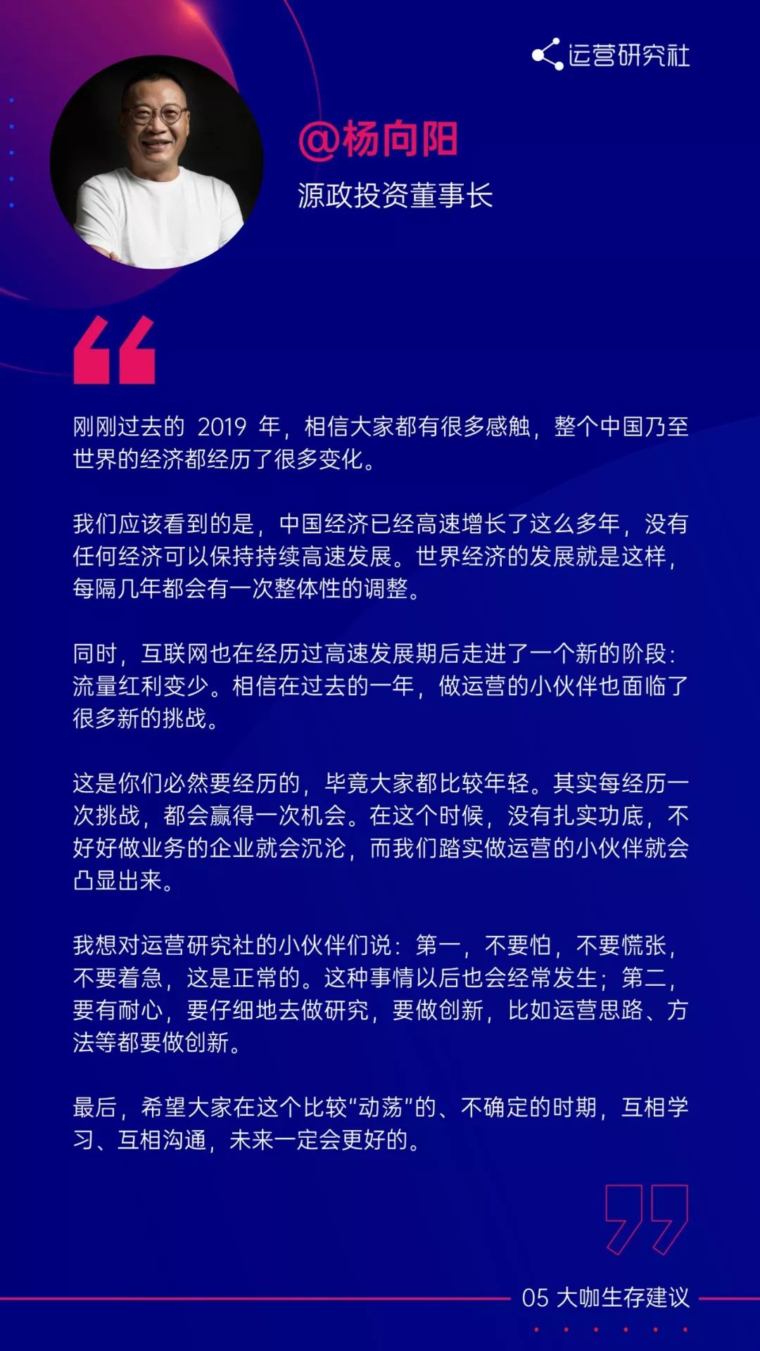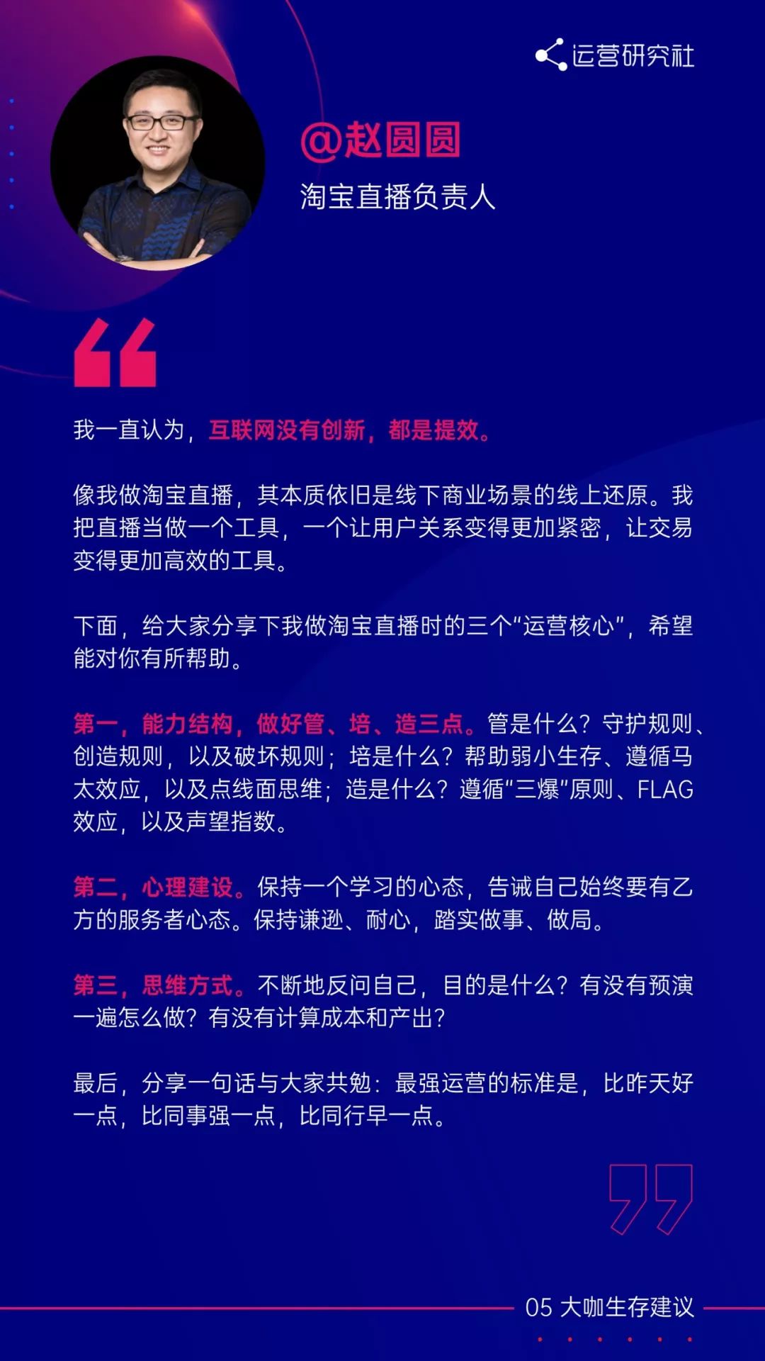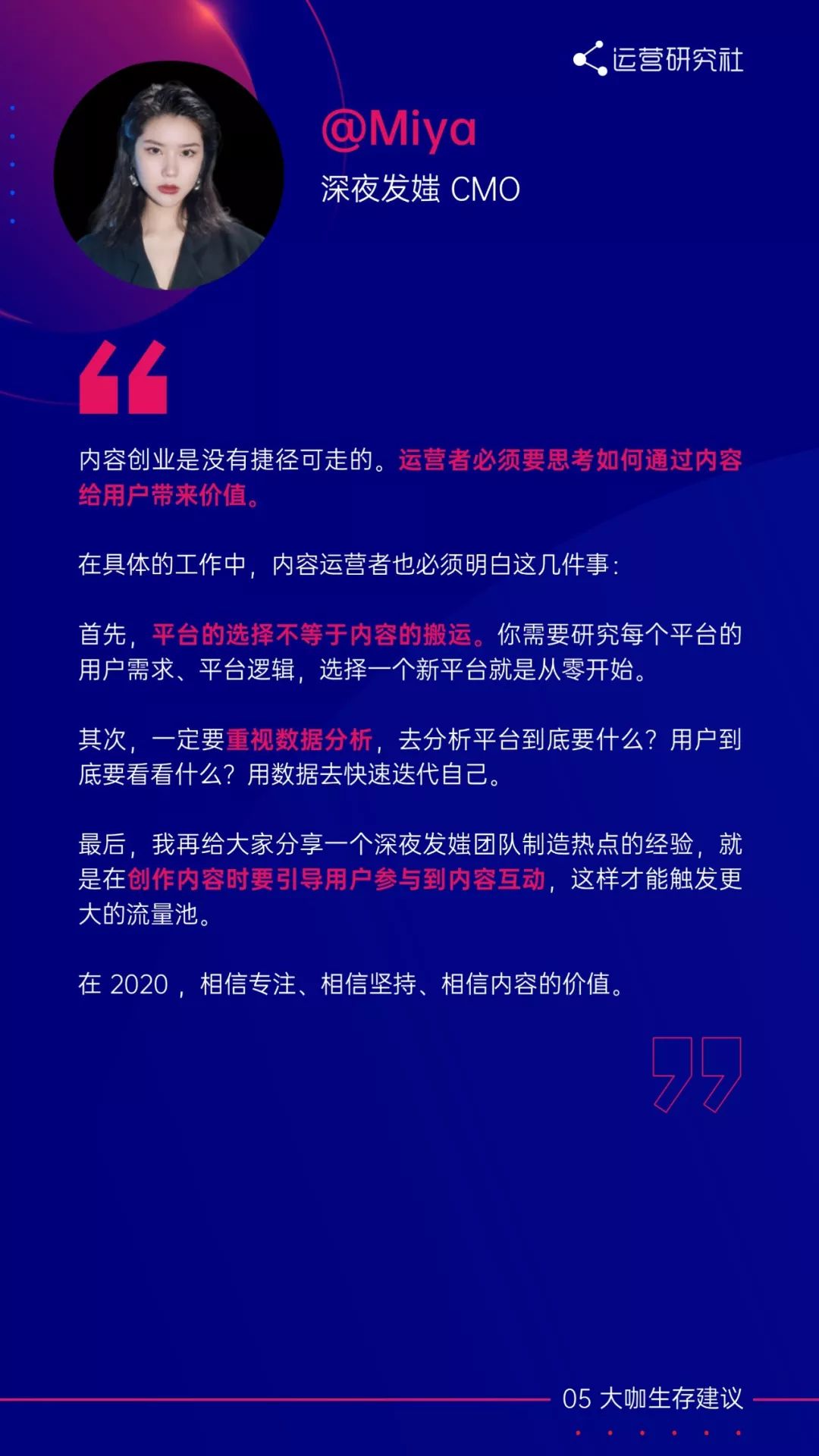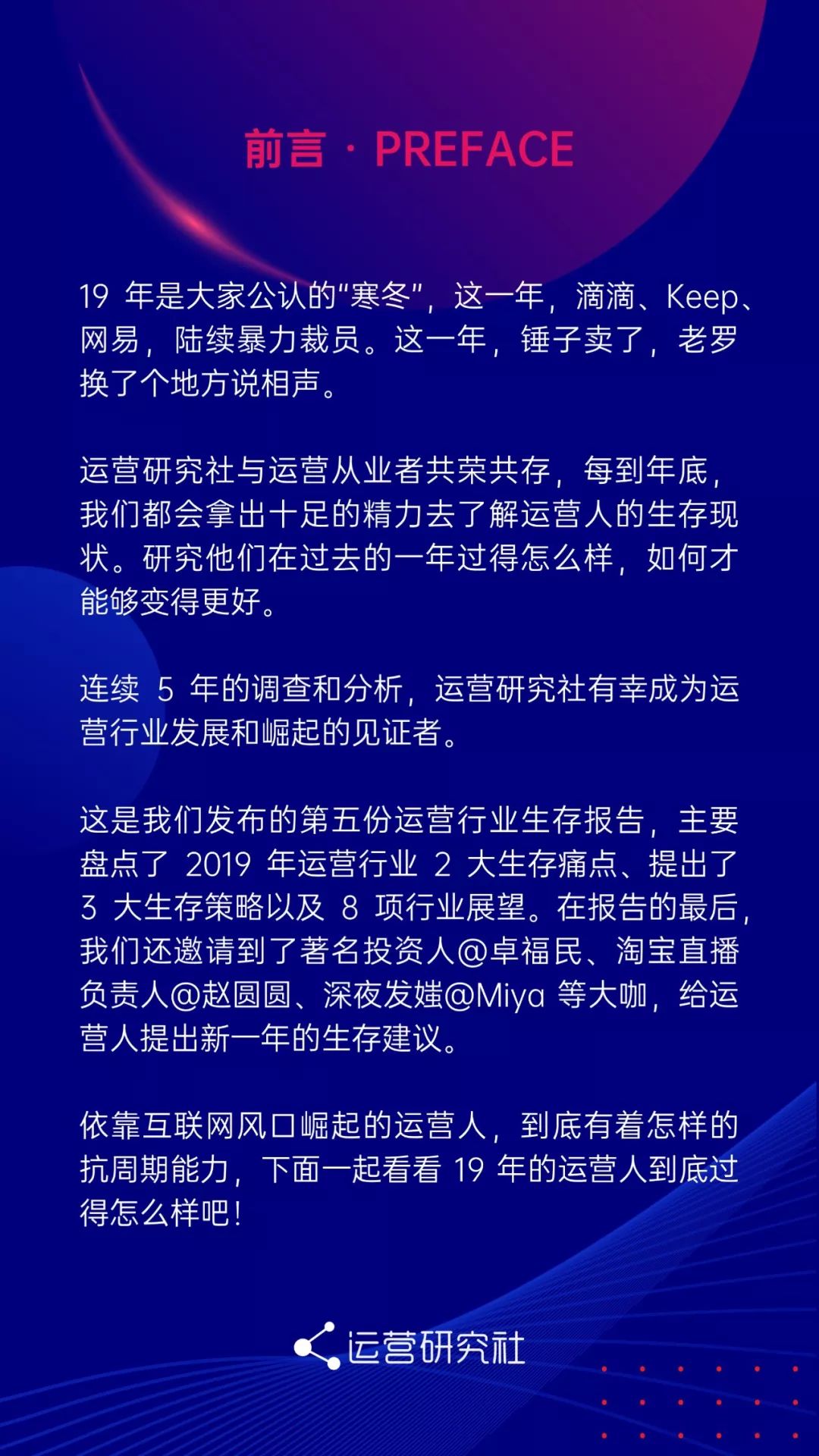 在报告的最后,我们还邀请到了著名投资人@卓福民、淘宝直播负责人@赵圆圆、深夜发媸@miya 等大咖,在白皮书上给运营人提出新一年的生存建议。