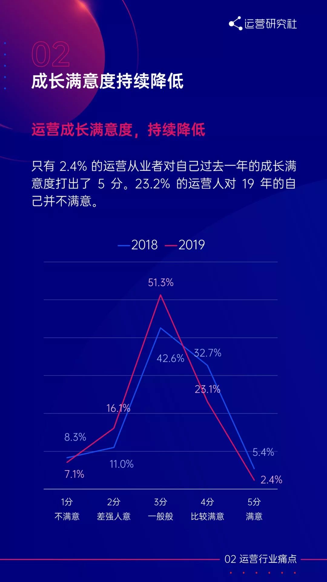 运营人的成长满意度持续降低。74.5% 的运营人对 19 年的自己并不满意,相比于 18 年来说,19 年的运营人满意度降低。
