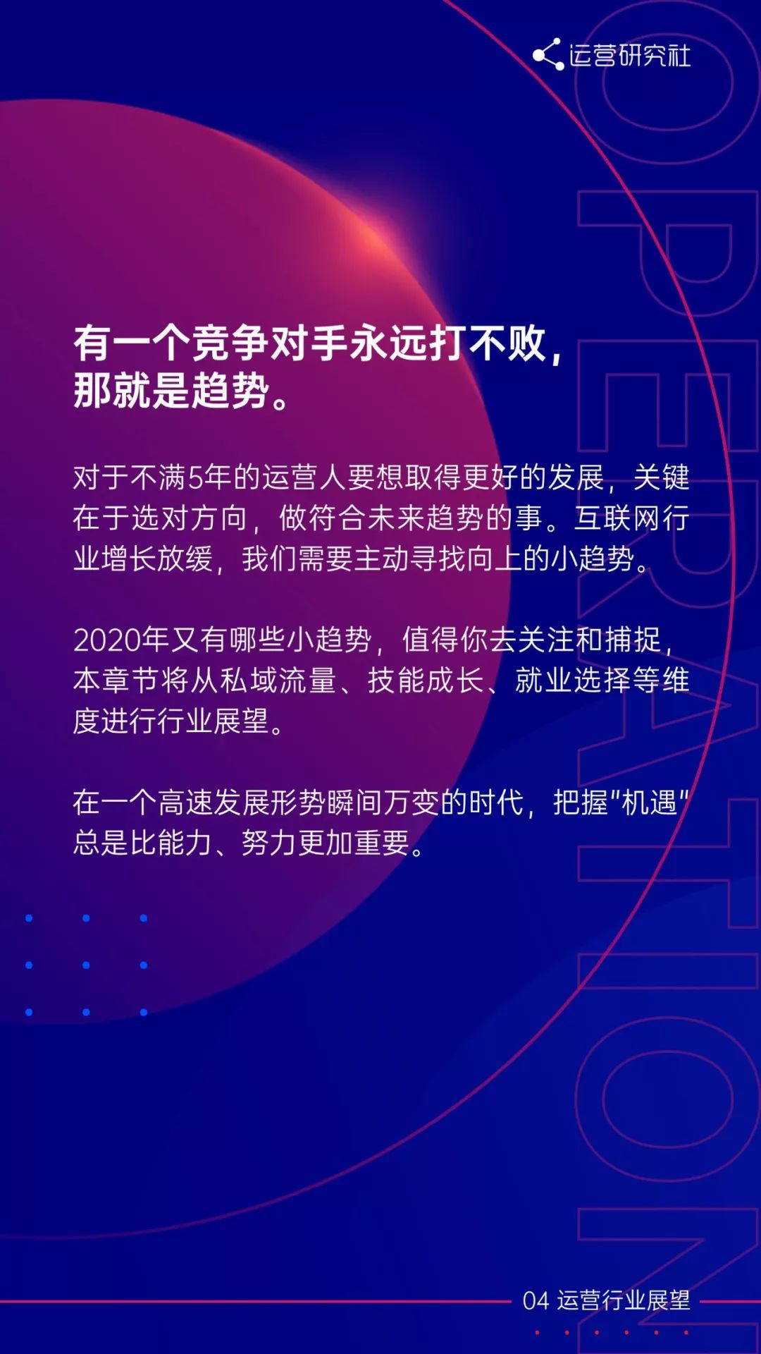 互联网行业增长放缓,我们需要主动寻找向上的小趋势。对于不满 5 年的运营人要想取得更好的发展,关键在于选对方向,做符合未来趋势的事。