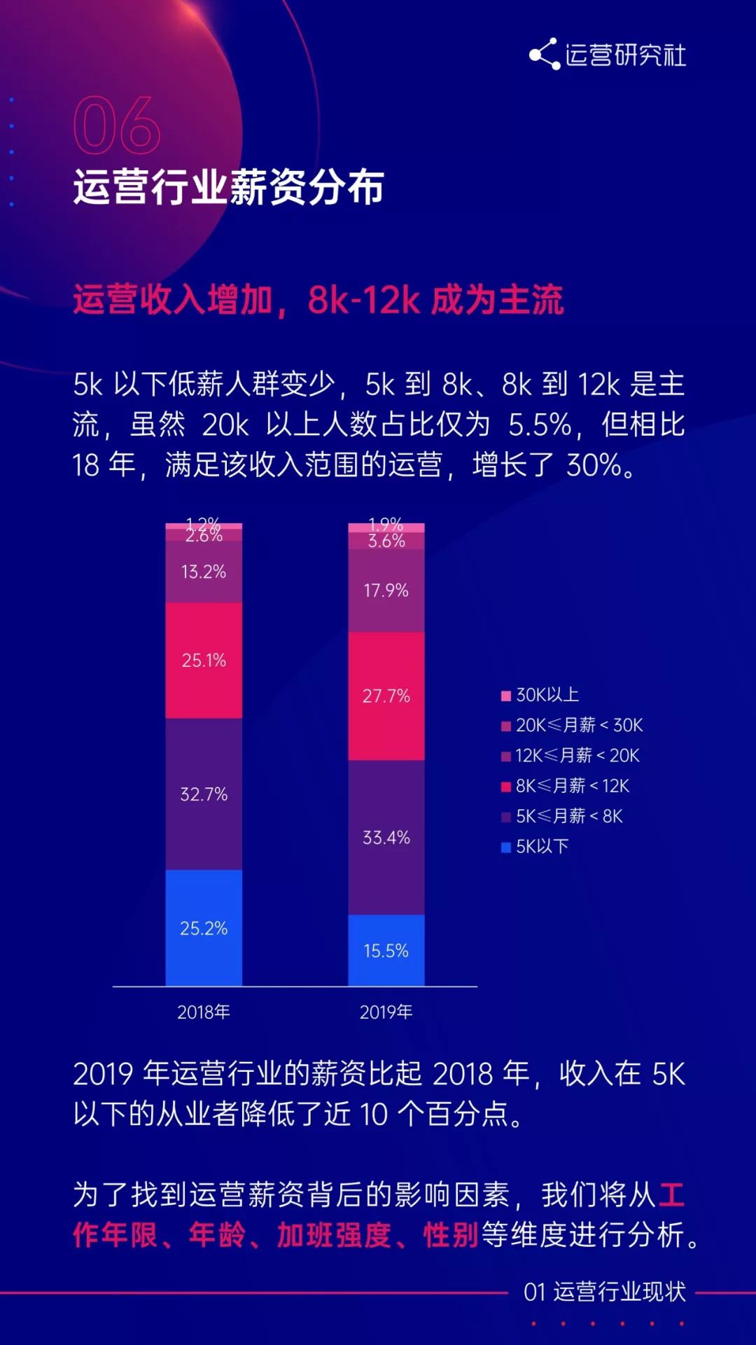 5k 以下低薪人群变少。5k 到 8k、8k 到 12k 是主流,虽然 20k 以上人数占比仅为 5.55%,但相比 18 年,满足该收入范围的运营,还是增长了 30%;