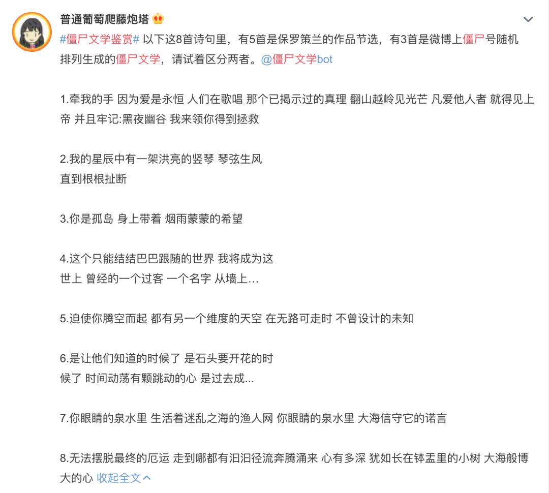 最早让我注意到僵尸文学的,是微博上的一则挑战,挑战者需要在8首诗中分别辨认出德国诗人保罗·策兰和僵尸号的作品。