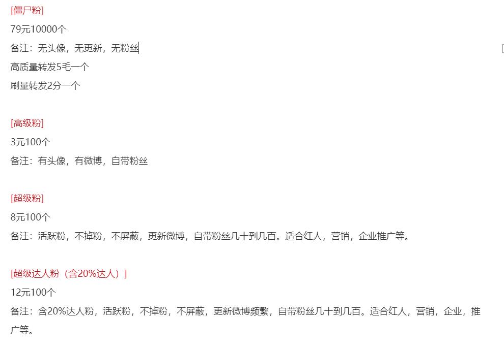 这牵扯到僵尸粉的质量,由于各家生产的方式不同,也有着不同标准:活跃度、牢固度、是否自带粉丝、能否能够互动,等等等等……