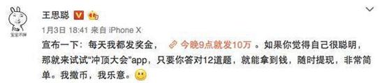 时间回到两年前的2018年1月3日,过生日的王思聪发了一条“我撒币,我乐意”的微博,宣布当晚9点将会在“冲顶大会”App中开始进行答题,全部答对的人将可以拿到他准备的10万元现金奖励。