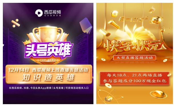 新芽NewSeed注意到,西瓜视频与快手在近段时间内,接连推出了全民互动知识直播答题活动。其中,西瓜视频的“头号英雄”在2019年12月14日正式上线,由今日头条、抖音联合出品,其前身便是2018年年初火极一时的“百万英雄”;快手则打造了“快手状元”,先是在跨年夜特别节目中小幅试水,后在今年1月8日正式启动,每天推出两场。