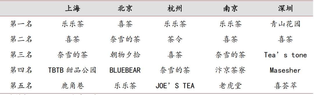 据艾媒咨询数据显示,可持续经营超过一年的奶茶店仅为18.8%。此外,品牌效应增强也将导致饮品老品牌们难以在该细分领域立足。另外,招商证券研究结果显示,在五大热门城市,人气最高的前五个线下茶饮店品牌中,喜茶、乐乐茶以及奈雪具有极大重合率,品牌力凸显,其它小品牌被边缘化。