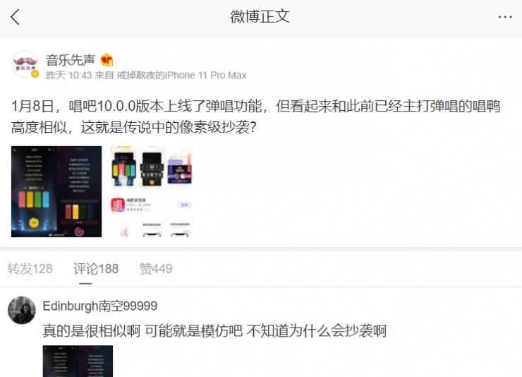 不过,随后唱吧矢口否认了媒体爆料的这一抄袭。但是通过媒体爆料的截图对比来看,两者确实高度相似。