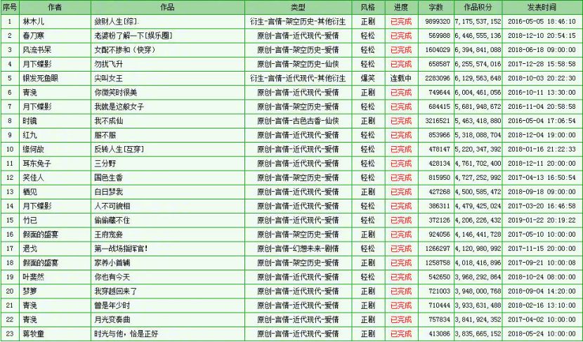 不久前,有微博用户整理了晋江积分榜上的200部作品,就引发了不少讨论的声音。娱sir的老用户朋友甚至用“潇湘化”来形容这个她爱了整个青春的网文网站,“并非贬义,只是晋江本来的属性不该是这样啊。”