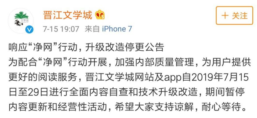 当日晚,官方微博发布公告,自2019年7月15日至29日,进行全面内容自查和技术升级改造,期间暂停内容更新和经营性活动。