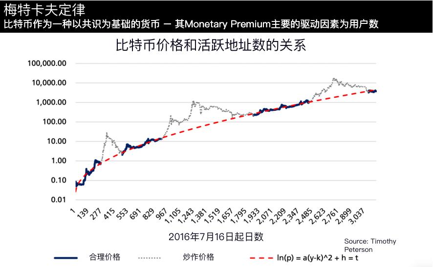 这个模型最开始用于互联网公司估值体系,像Facebook,用户数量和估值有非常强的相关性。当把这个模式套用到比特币上,也有类似的效果——比特币的价格和活跃地址呈正相关性。