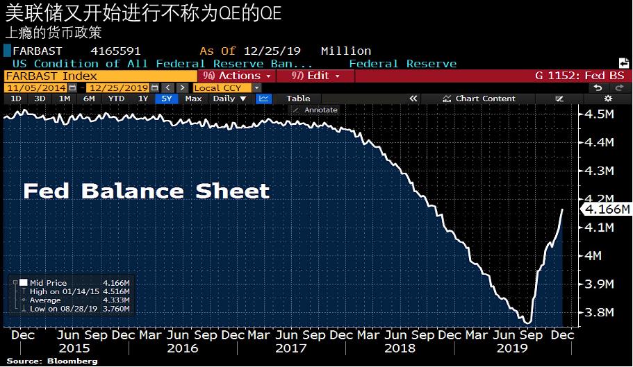 转变发生在2019年第四季度,短短一个季度美联储将2018年减少的这一部分美债的持有释放到了市场,也就是说2019年第四季度美联储将2018年收回的美元流动性全部放回市场。