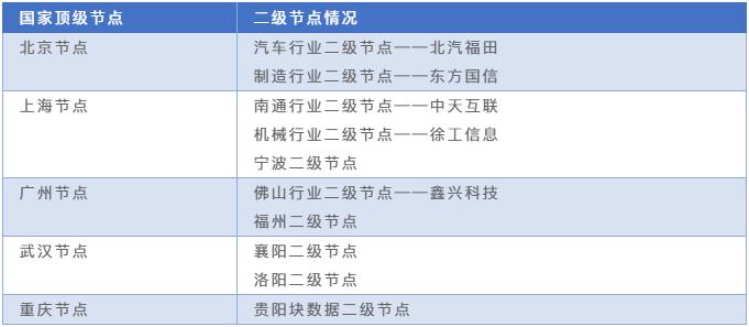 截至2019年7月31日,全国已经完成了17个二级节点部署,重点面向汽车制造、装备制造、船舶制造、工程机械、家电制造等不同行业提供标识编码注册、解析、业务管理、应用对接服务。一大批企业积极推进企业应用,三大基础电信企业也在加快探索公共递归节点建设。此外,全国范围内部署中的二级节点有11个,拟建设二级节点的单位有45家;拟签约二级节点单位有7家。