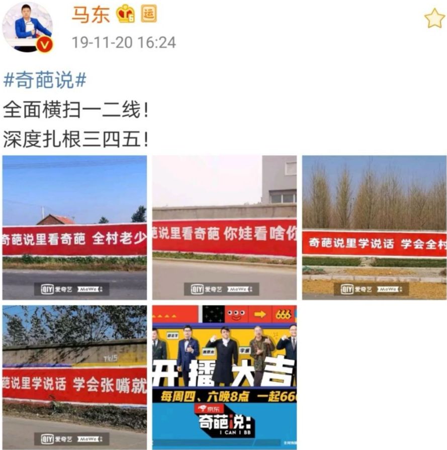 2019年11月20日,《奇葩说》第六季开播,马东在微博晒出“奇葩说里看奇葩全村老少笑哈哈”的刷墙广告,并配以文字“全面横扫一二线 深度扎根三四五”。11月26日《庆余年》播出,“咱们县90%的女孩都去看庆余年了”的横幅标语随着网友催更的步伐走向大众。