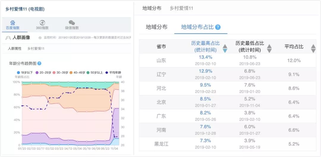 查看《乡村爱情11》的用户数据可见,上至50岁中老年,下至18岁高中生,不管是大本营黑吉辽,还是南方云贵川,都有观众。《乡村爱情》系列的用户年龄层和分布区域非常广泛。
