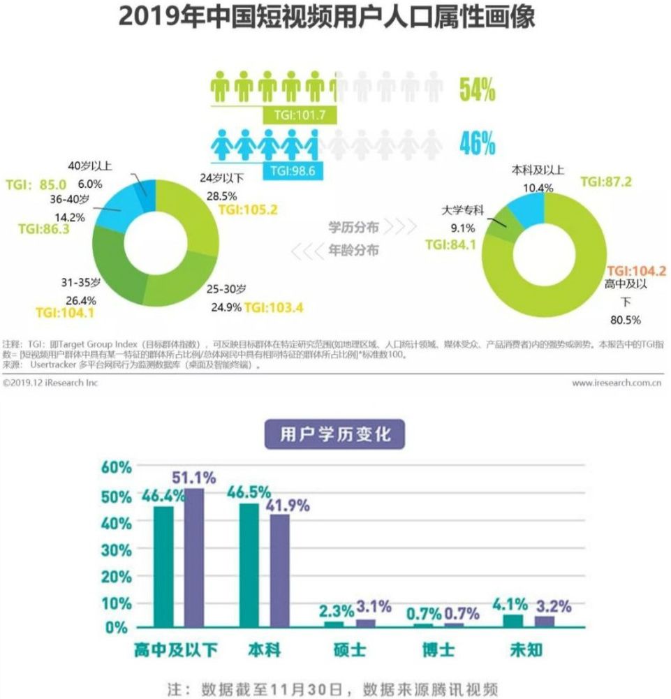 根据腾讯视频2019年的剧集年度报告,本科学历用户占比41.9%,高中学历及以下用户占比51.1%。而根据艾瑞咨询2019年12月的数据,短视频用户中9.1%为大学专科学历,10.4%为本科及以上学历,高中学历及以下占比80.5%。