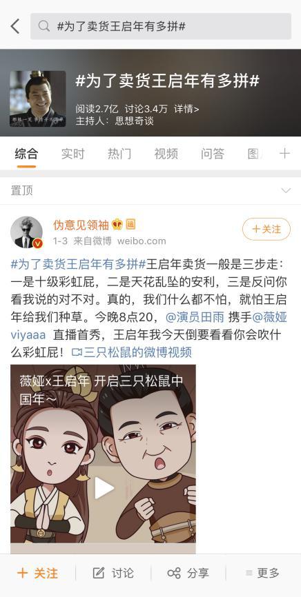 直播当天下午,通过在微博端建立#为了卖货王启年有多拼#相关话题,联动众多娱乐号、段子手等。借助《庆余年》影视热度与王启年的人设属性,充分调动起网友的发声欲望和参与热情。正好衔接了1月3日晚的薇娅联合王启年饰演者田雨直播首秀的时间段。微话题的辐射使得内容讨论量迅速增长,截止目前,该话题微博话题阅读2.7亿,讨论3.4万,实时内容依旧更新不断。