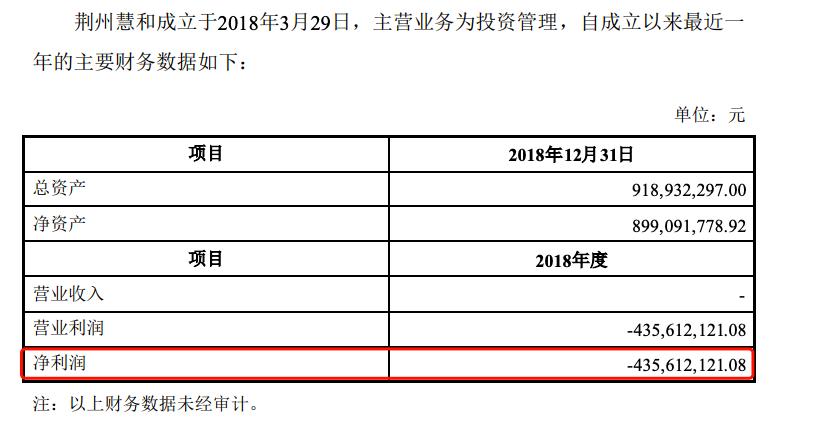 荆州慧和成立于2018年3月,当年全年便亏损4.4亿元。