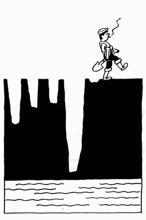 画中人拿着一把铁锹不停地在挖水井,他挖了无数口水井,但是每一口水井他都没有挖到头,他永远也不可能喝到水。