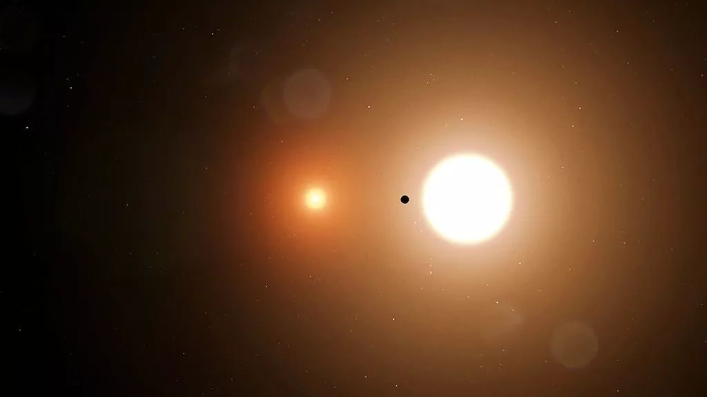 系统中的两颗恒星每15天绕轨道运行一次。一个比我们的太阳大10%左右,另一个则更冷、更暗,只有太阳质量的三分之一。