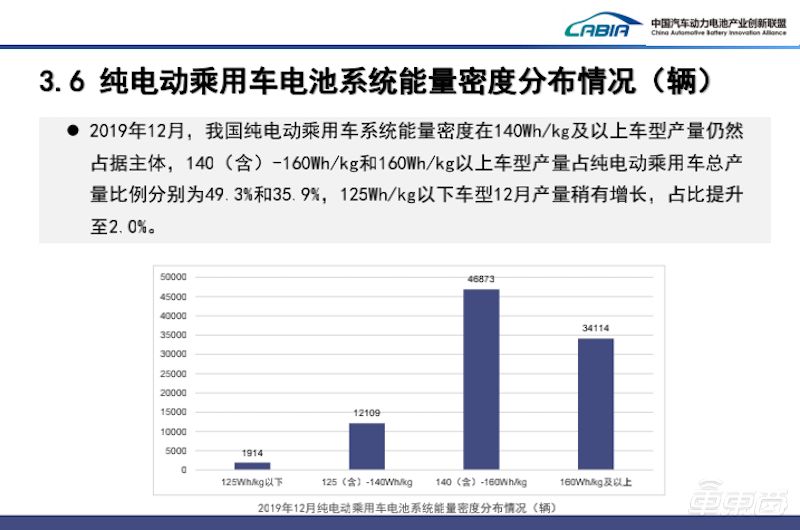 而在纯电动乘用车方面,2019年12月,国内车型动力电池系统平均能量密度主要集中在140Wh/kg-160Wh/kg,占比达到49.3%,系统能量密度在160Wh/kg以上的纯电动乘用车型市场占比35.9%,系统能量密度125Wh/kg以下的车型数量占比为2%。纯电动乘用车动力电池系统的平均能量密度,较2018年同期也有所上升。