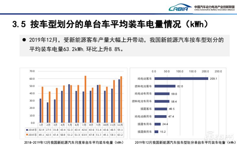 2019年动力电池装机量上升的另一大原因,是受新能源客车产量上升带动的,新能源汽车平均带电量的上升。据了解,2019年12月,我国新能源汽车单车动力电池装车量达到63.2kWh,环比上升8.8%。