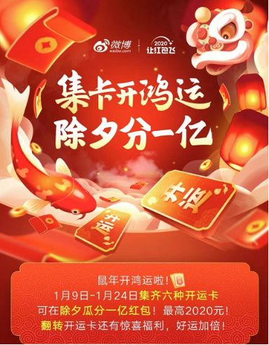 微博新年集开运卡活动时间在1月9日至1月24日,玩法和支付宝集五福如出一辙,1月24日也就是除夕18:00前集齐6种开运卡,包括万能卡,即可合成鸿运红包,在除夕当天开启红包就可以参与瓜分1亿!微博表示,集卡成功后100%有奖,最高可以分到2020元。