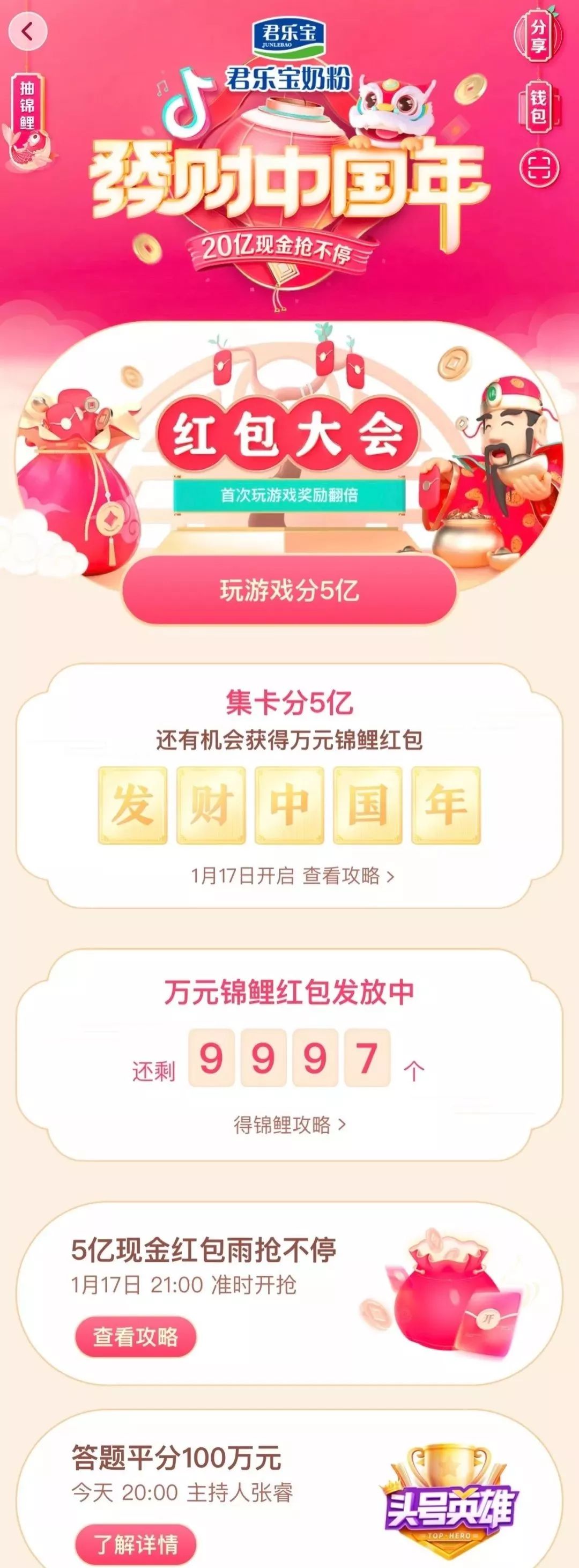 1月14日,抖音方面宣布,“发财中国年”春节红包活动已经启动,1月14日至1月31日期间,用户完成集卡、红包雨、玩游戏等活动,即可参与分享20亿元红包,并有机会抽取万元锦鲤红包。