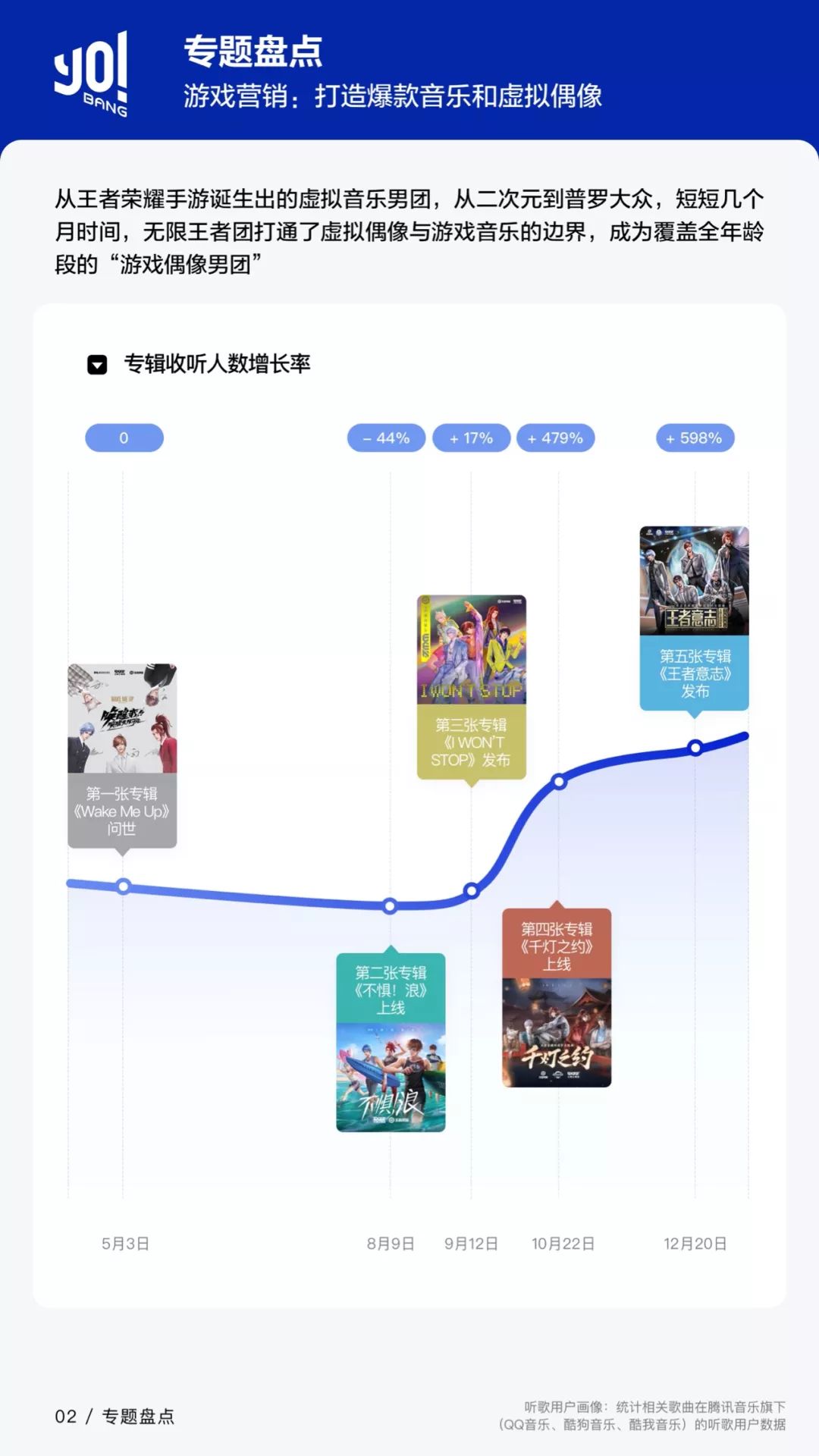 专辑收听人数增长率出现了44%的下滑,但在之后的第三张专辑发布后,其收听人数增长率开始增长,在《王者荣耀》四周岁主题曲《千灯之约》发布时,收听人数增长率达到479%,第五张专辑时达到了598%,说明了游戏音乐正在真正穿透游戏玩家群体。