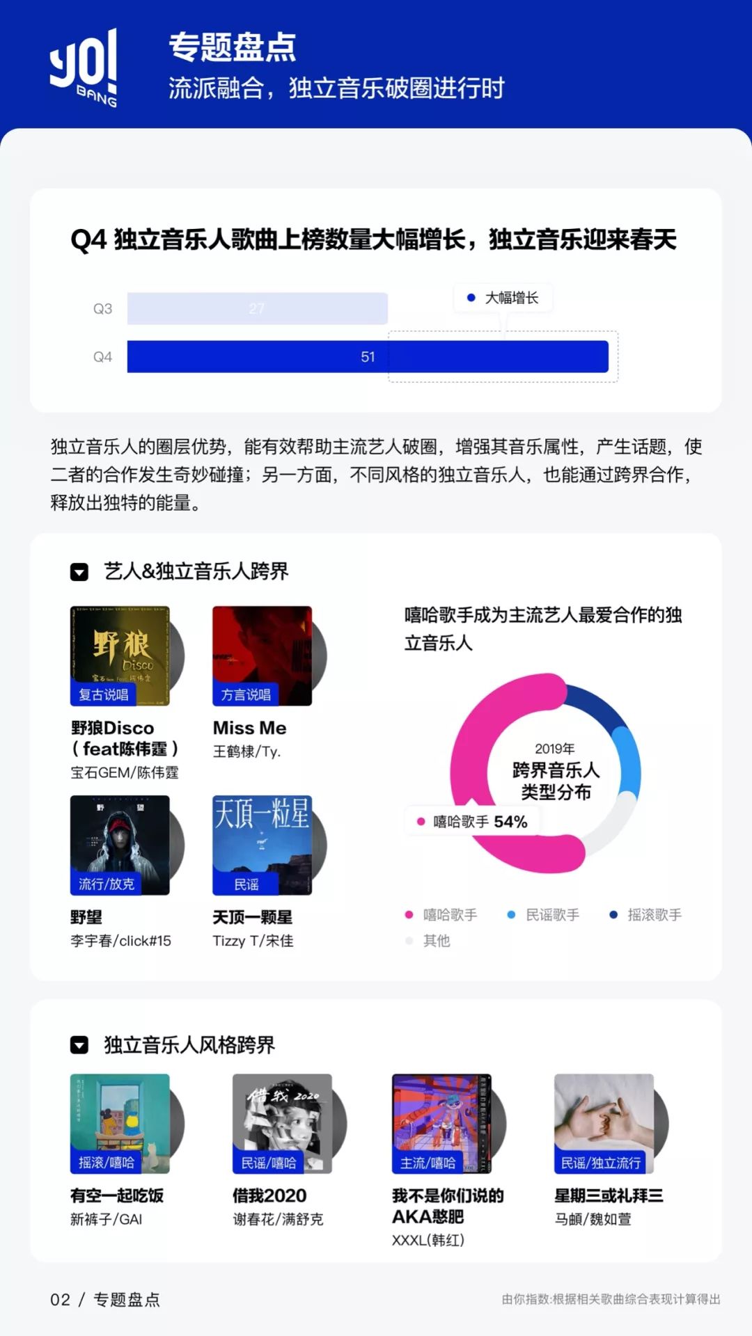 主流歌手与独立音乐人在当下呈现出的边界弱化现象,让两个群体有了齐头并进的可能,共同影响着我们音乐市场的发展,在2019年第四季度中,我们也看到了这两个群体带来的音乐市场之变化。