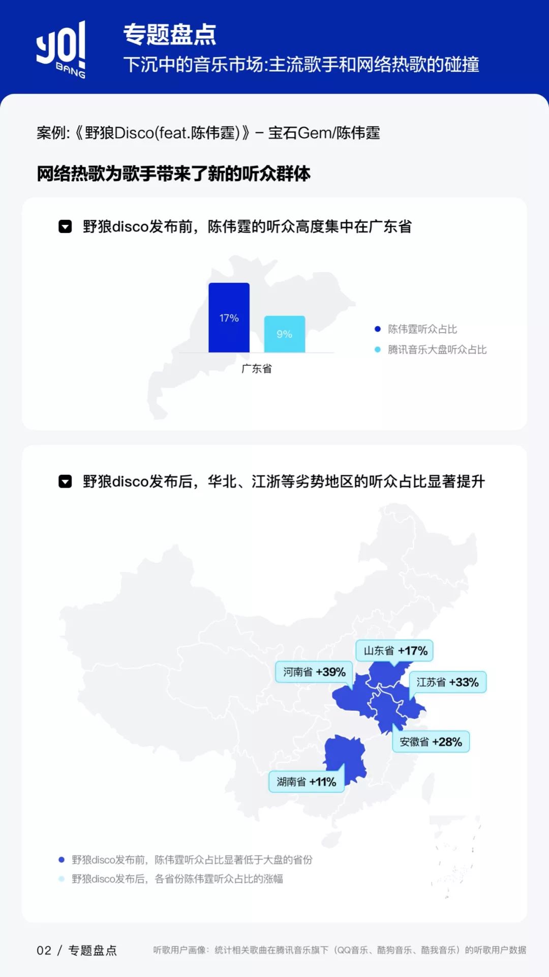 据《报告》显示,在《野狼Disco(feat.陈伟霆)》发布前,陈伟霆的听众高度集中在广东省,而在歌曲发布后,华北、浙江等地区的听众占比显著提升,其中河南省听众占比增长了39%。