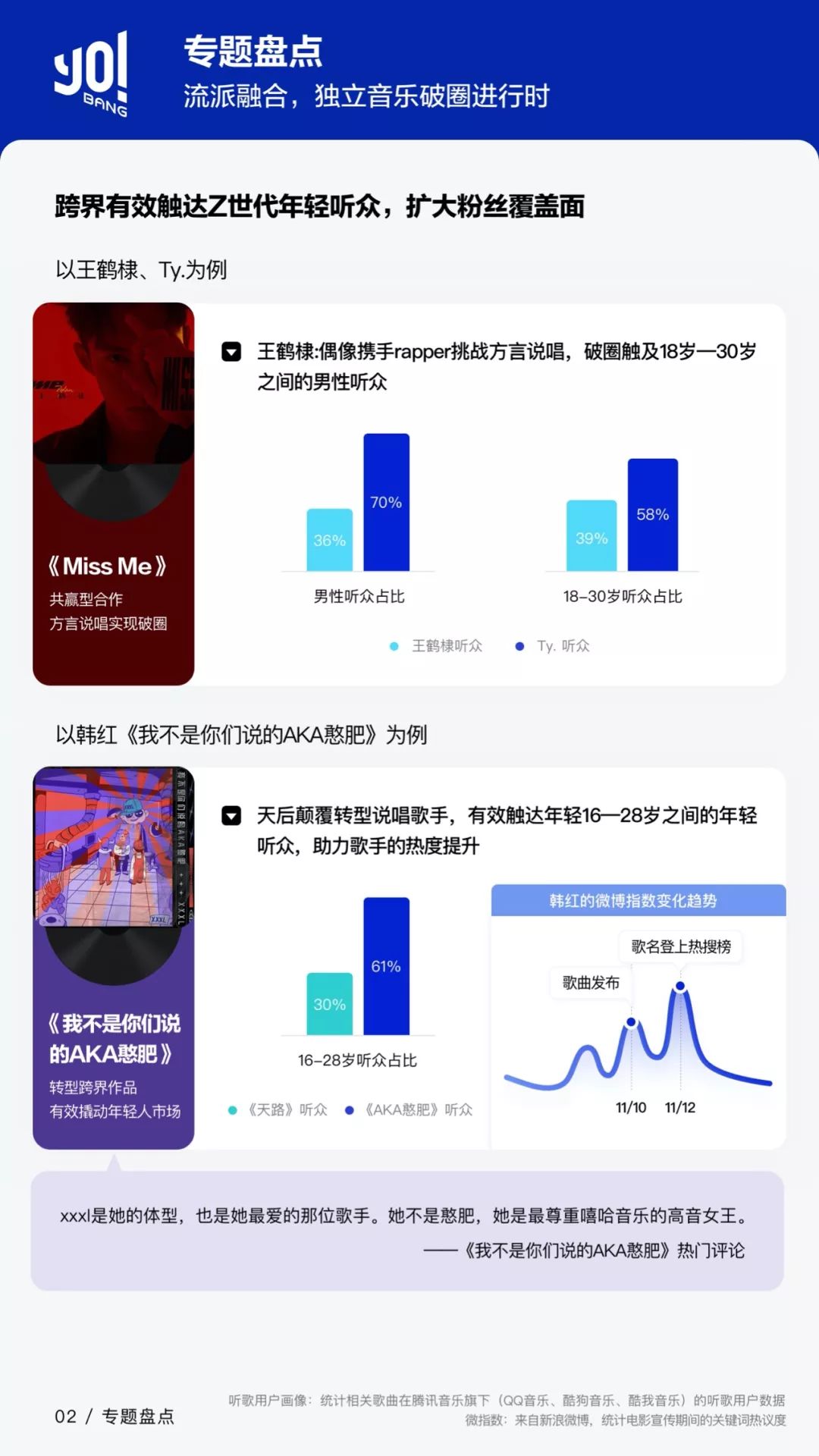 因为独立音乐作品或者说网络热歌的影响力愈发增长,让主流歌手开始关注独立音乐作品及网络市场走向,带来了主流歌手们的各种跨界。除了前文提到的与独立音乐人跨界合作外,也有音乐风格上的跨界。在2019年第四季度,韩红就借助嘻哈风格歌曲《我不是你们说的AKA憨肥》完成了自我突破,据《报告》数据,韩红这首歌16-28岁听众占比达到61%,远超其曾经代表作《天路》的30%。