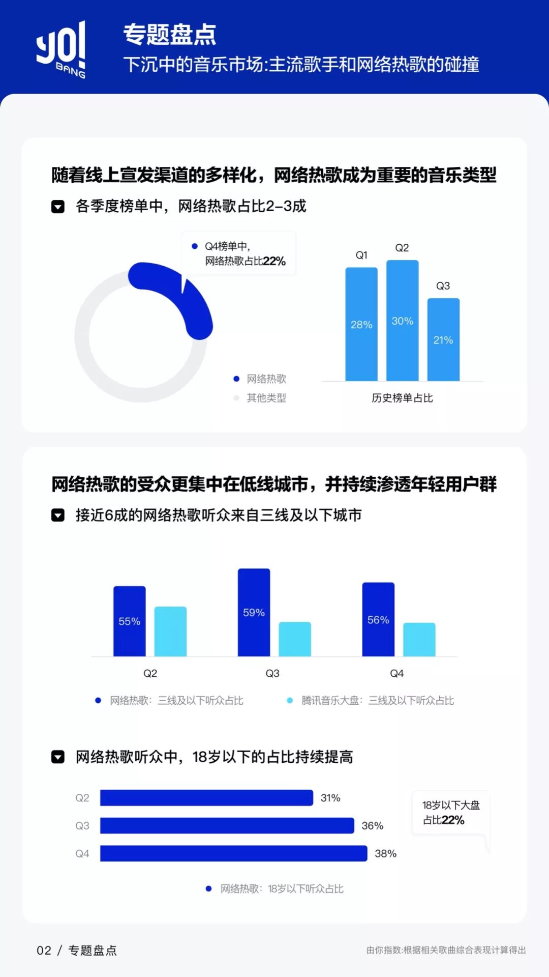 据由你音乐榜的《报告》显示,各季度榜单中网络热歌的占比都达到2-3成,去年第二季度更是高达30%,而榜单中所指的“网络热歌”其实也可以大致归属到独立音乐人的作品。正如前文所说,如今独立音乐作品能够享受到更多的宣传资源,这也才有了网络热歌成为市场中重要的分类之一的结果。