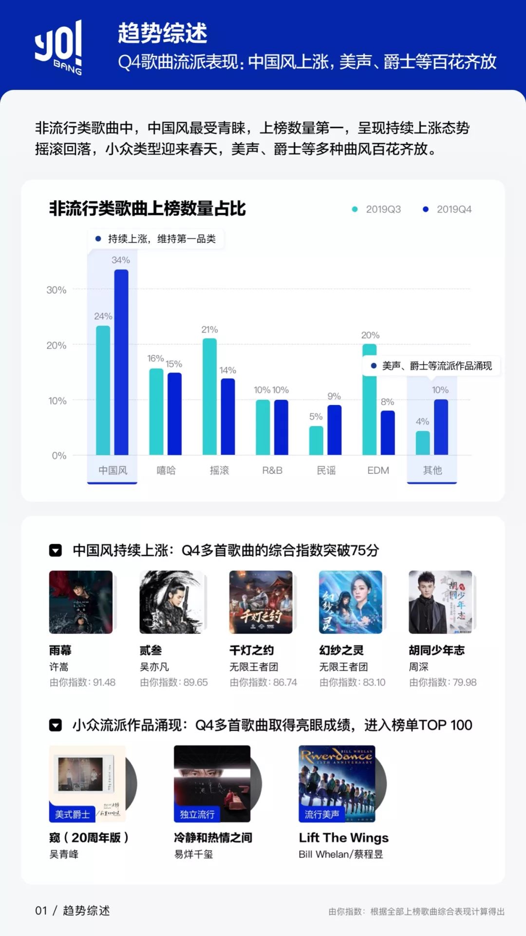 据《报告》显示,在2019年第四季度非流行类歌曲上榜数量占比中,中国风继续保持上涨趋势并始终维持在第一品类,美声、爵士等其他流派作品也猛增,这其中就多亏了主流歌手的带动。