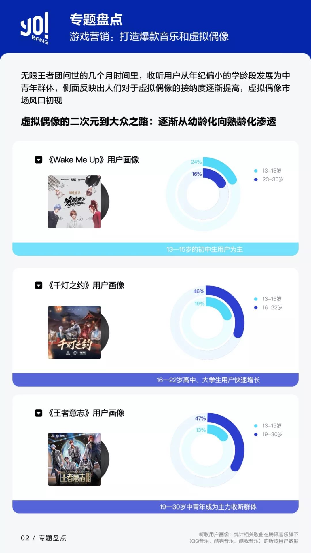 据《报告》显示,无限王者团第一张专辑的用户画像中,13-15岁用户占比达24%,初中生用户为主,而到了第四张专辑《千灯之约》时,16-22岁的高中、大学生用户占比达到了46%,再到第五张专辑《王者意志》时,19-30岁用户占比达47%,这与第一张专辑时的用户画像已经有了较大的区别。