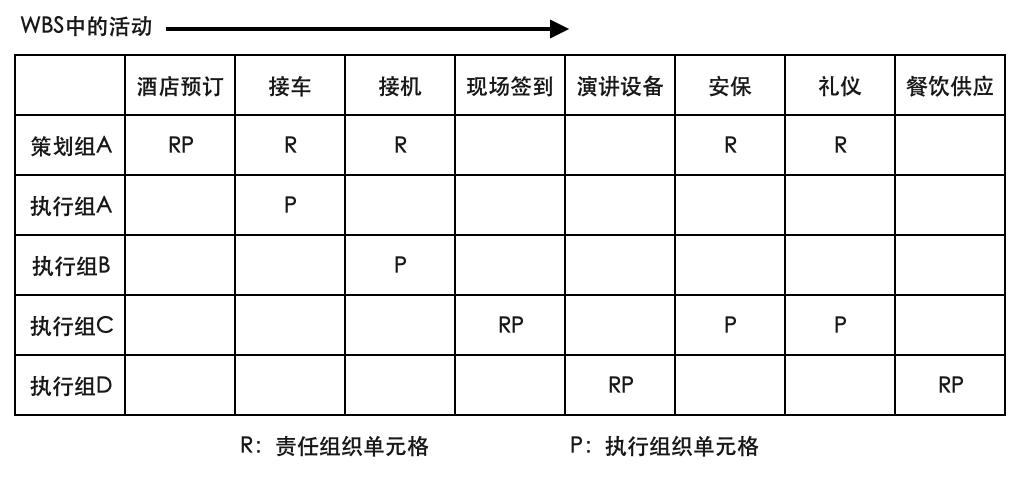 RAM将工作分配给负责和执行的组织、团队或个人。如上图,就是一份按照团队进行任务分配的RAM。对大型的活动项目而言,将具体的工作分配给组织部门或团队会更有效。通过表格矩阵将具体的工作落实到具体的组织或者成员去实施。