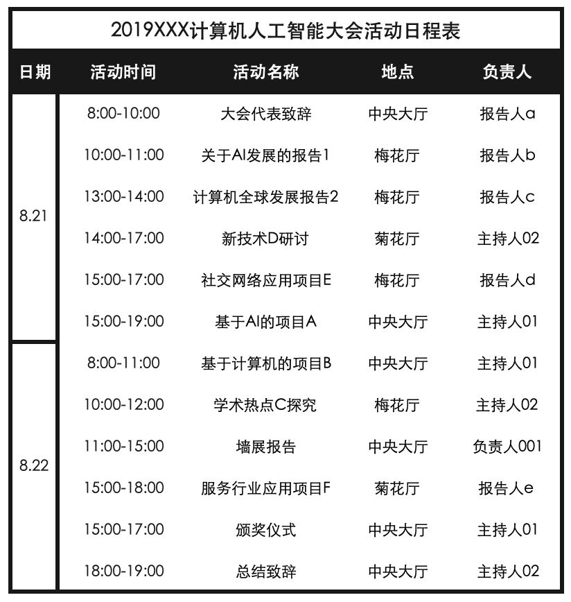 (5)将甘特图转换成对应的日程表。用表格的形式再次呈现甘特图中的活动时间、人员和场地等关系,最终的日程表就生成了。