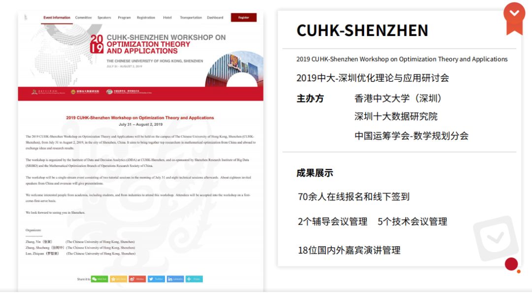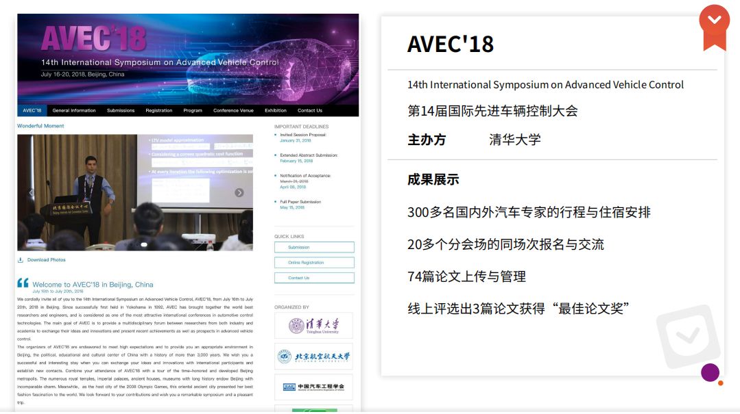 多年来,百格活动学术会议系统已经成功服务百场学术会议。其中包括,第14届国际先进车辆控制大会、2019中大-深圳优化理论与应用研讨会、第八届国际医疗地质会议、第九届国际煤燃烧学术会议等著名学术会议。