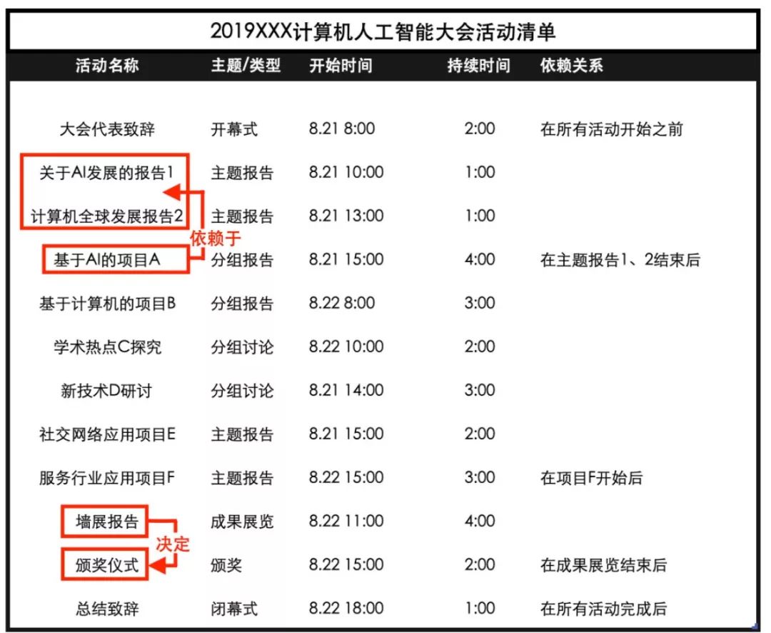 如上图,“基于AI的项目A”(依赖性活动)必须在“主题报告1、2”(决定性活动)结束后才能开始,“颁奖仪式”(依赖性活动)的进行依“墙展报告”(决定性活动)的进展状况或结果而定。